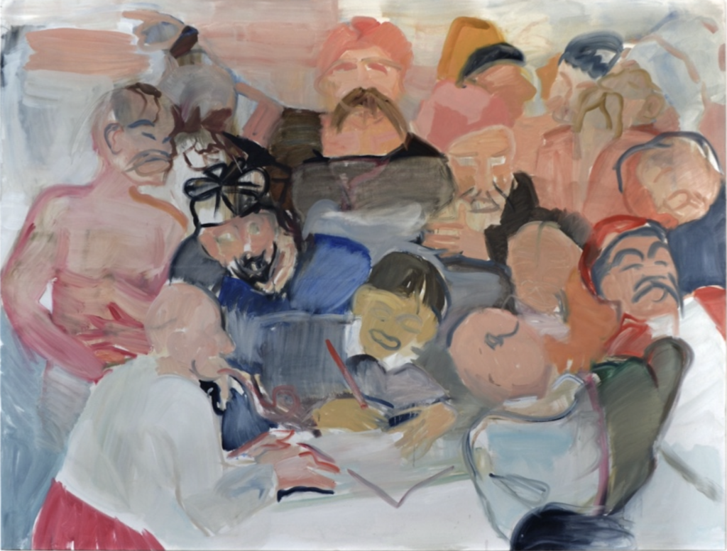 Die Personen in Repins Bild sind hyperrealistische Porträts zeitgenössischer Größen aus Politik und Kultur, die in die Rolle ihrer Vorfahren schlüpfen und ein Ereignis nachspielen, das sich 1676 zugetragen haben soll. Die historische Szene zeigt die Kosaken dabei, wie sie einem Schreiber einen Brief an den Sultan Mehmed IV. diktieren. Der Legende nach verfassten sie einen Schmähbrief mit kaum zu überbietenden vulgären Beschimpfungen, der in seinem derben Vokabular den Battles heutiger Gangsterrapper in nichts nachsteht. Im Brief wünschten die Kosaken den türkischen Sultan zum Teufel, anstatt sich – wie von ihm gefordert – zu unterwerfen.² Der Spaß, den die Männer beim Diktieren angeblich haben, ist ihnen in Repins Gemälde ins Gesicht und in ihre Körper geschrieben. Miskevych fängt in ihrer Malerei dagegen nurmehr das Tumulthafte der Szene ein – wie eine Skizze einer fernen Erinnerung. An die Stelle von Repins leuchtendem Rot sind gedeckte Töne getreten. Wer die Legende und das historische Gemälde nicht kennt, sieht in Miskevychs Werk allein, dass inmitten von wild gestikulierenden Männern jemand sitzt und schreibt. Eine andere Gestalt im Hintergrund zeigt, wie in der Vorlage auch, nach links ins Nirgendwo. Die Gesichter aber sind blicklos – so wie in vielen Werken der Ukrainerin. In der Kleinschönacher Ausstellung stellt das Bild die einzige historische Referenz dar und ist auch das einzige Werk, das auf die Herkunft der Künstlerin verweist.