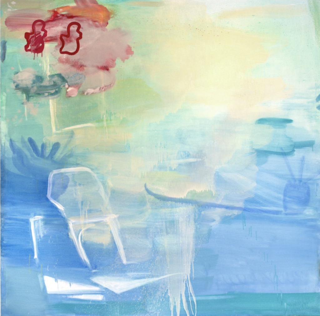 Ist das Gebilde links in der Malerei Hippopotamus (2023, Öl auf Leinwand, 210 x 210), ein Stuhl? Deutet die blaue Linie rechts eine Tischplatte an? Sind die roten Umrissformationen oben links im Bild übergroße nilpferdförmige Plätzchenformen oder etwas ganz anderes?