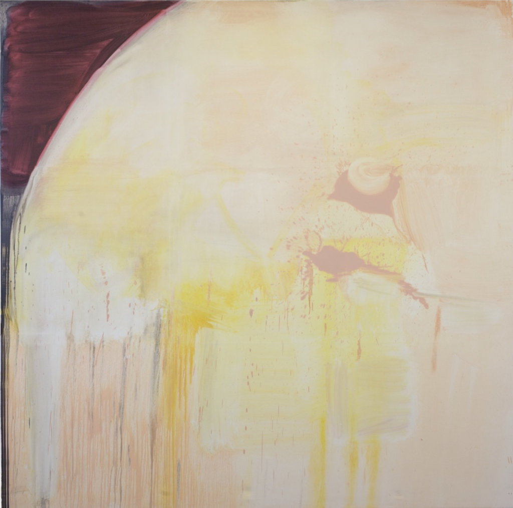 Die 210 x 210 cm große Malerei mit dem Titel Sportsman von 2023 etwa gibt nur dünnflüssig verlaufendes Gelb, Weiß und Grau und fleischfarbige Flecken zu sehen – verteilt auf einer quadratischen Leinwand. An der linken oberen Ecke werden die dahinfließenden durchscheinenden Farbwolken und Farbspritzer gehalten von einem dunklen Bordeaux, das sich in einem pink schimmernden klaren Bogen von dem hellen Gelb und Ocker abgrenzt. Warum dieses Bild Sportsmanheißt, bleibt rätselhaft, hat, wie die Künstlerin sagt, mit persönlichen Erinnerungen zu tun. Gelbtöne und Weiß wurden mit einem breiten Quast aufgebracht. Die dünnflüssige Farbe verläuft auf der Leinwand, mischt sich mit weißen und grauen Farbspuren, die wie auf die Leinwand geworfen scheinen, daneben leicht nach rechts aus der Mitte versetzt zwei inkarnawarbige Flecken. An einigen Stellen schimmert die Farbe, glüht auratisch; an anderen schillert sie sanft. Es sind gleichermaßen Farbformationen des Verfalls und der Verwundung wie Eindrücke, die von einer Welt in statu nascendi künden, einer Welt, die nach uns kommt oder vor uns war.